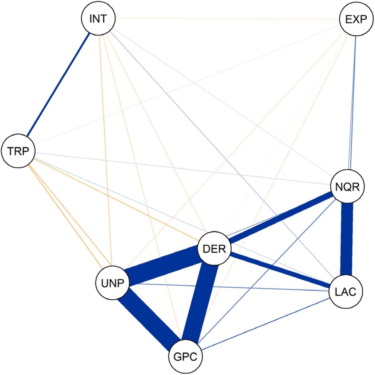 GPC, UNP, and DER were associated with a significant reciprocal association. LAC was associated with NQR, and the two only marginally correlated with DER.