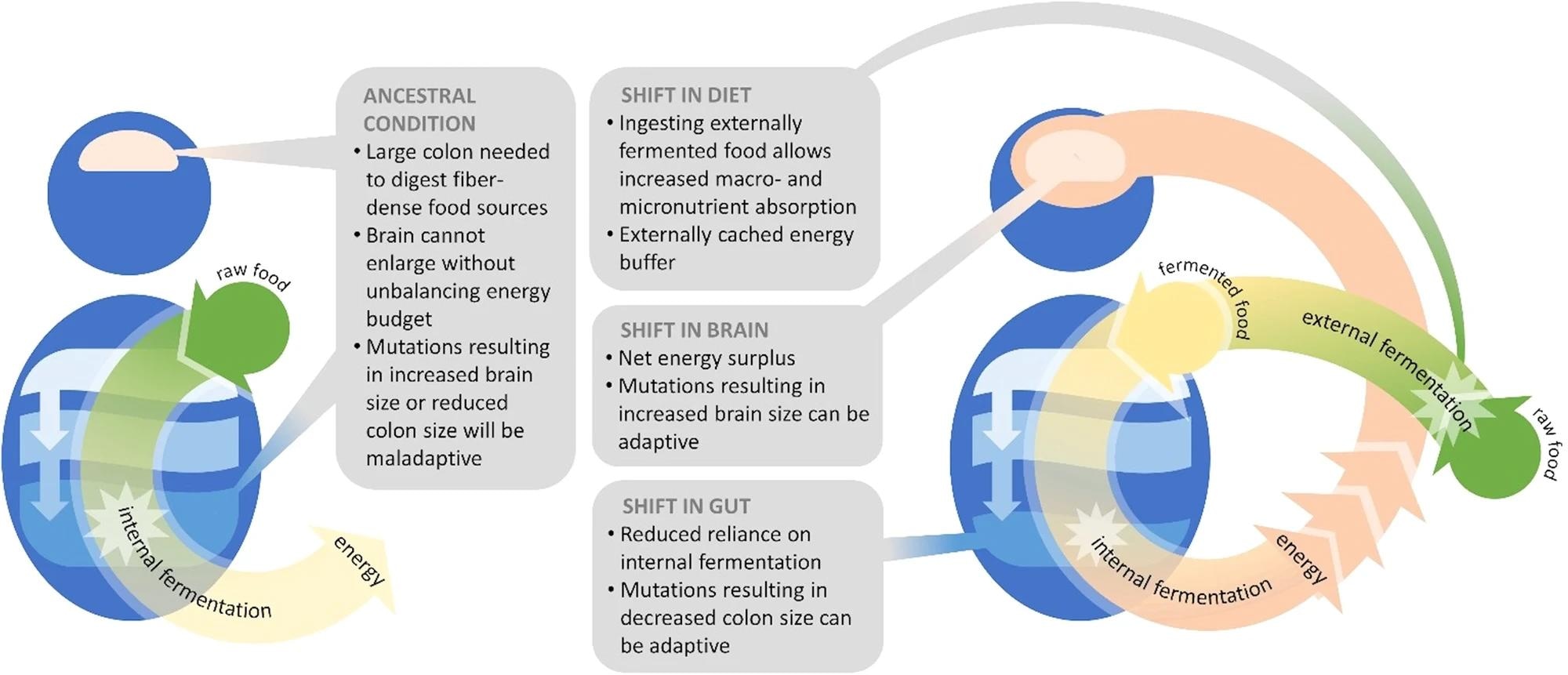The researchers in the present review propose the "external fermentation hypothesis," suggesting that adopting fermentation technology by early hominins was a key mechanism for human brain expansion and gut reduction. They suggest that the conversion of gut fermentation into an external practice may have been a significant innovation, setting the metabolic conditions for the selection of brain expansion. The present review offers novel insights into the evolution of the human diet and the anatomy of the gut and brain, inviting commentary and experimental tests to further validate the hypothesis.