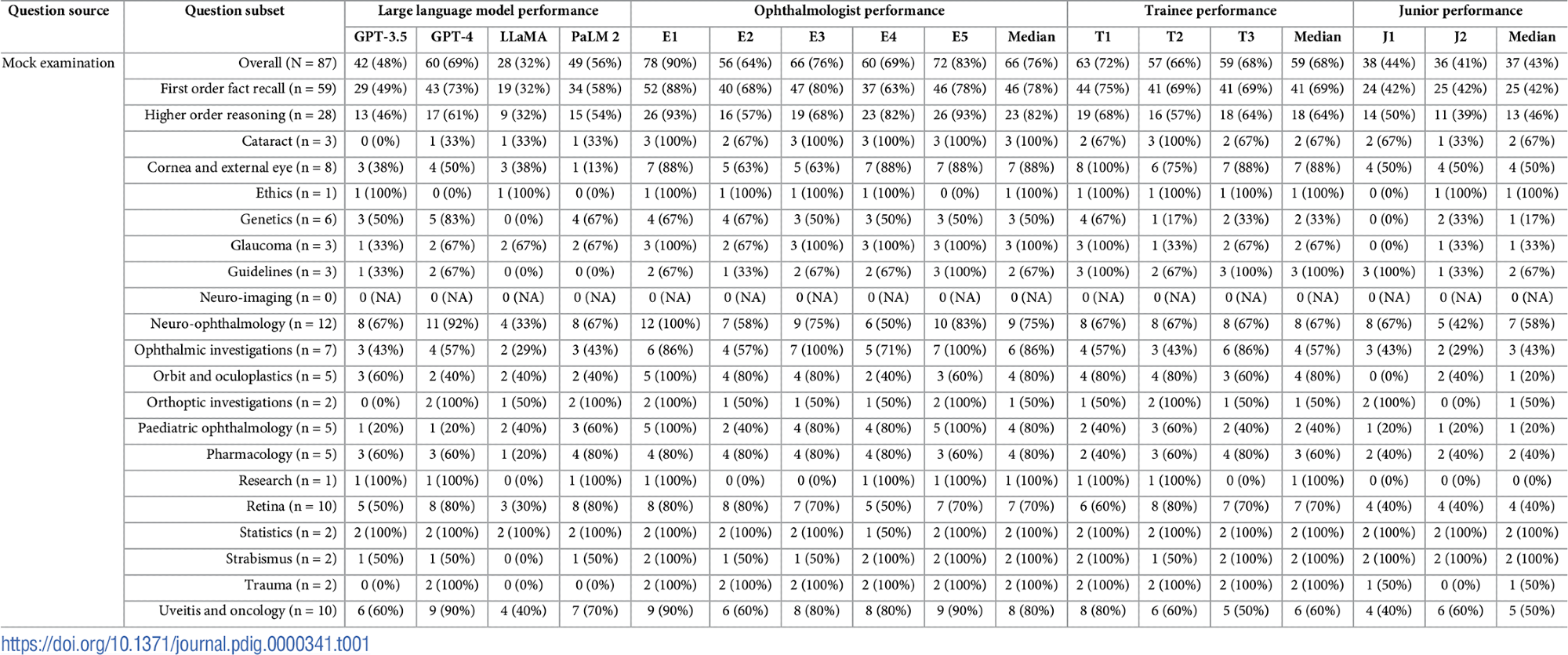 Examination characteristics and granular performance data. Question subject and type distributions presented alongside scores attained by LLMs (GPT-3.5, GPT-4, LLaMA, and PaLM 2), expert ophthalmologists (E1-E5), ophthalmology trainees (T1-T3), and unspecialised junior doctors (J1-J2). Median scores do not necessarily sum to the overall median score, as fractional scores are impossible.