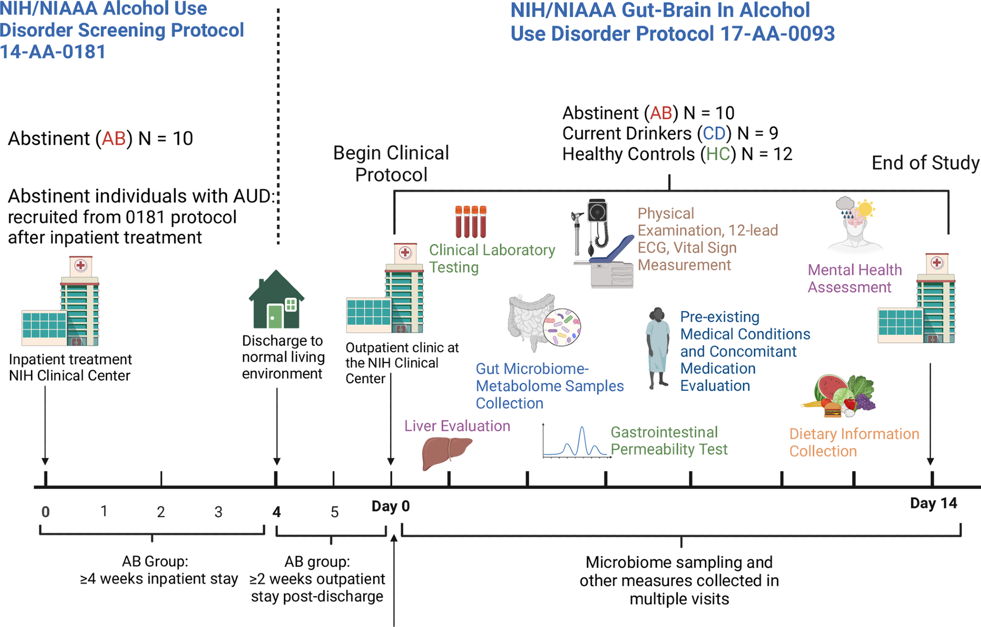 Schematic representation of the study design. Abstinent individuals with AUD (AB) were enrolled in the study after ≥4 weeks of inpatient treatment (NIH/NIAAA treatment protocol 14-AA-0181), followed by ≥2 weeks of “real life” (living their normal life). Non-treatment-seeking, currently drinking individuals with AUD (CD) and matched healthy controls (HC) were also enrolled. Fecal samples from the study participants were collected and processed for gut microbiome and metabolome analysis. Physical examination, 12-lead ECG, vital sign measurements, and laboratory tests were performed. Information on physical and mental health (including information on medical conditions and medications) and dietary intake was gathered and analyzed. Transient liver elastography and gastrointestinal permeability testing were carried out.