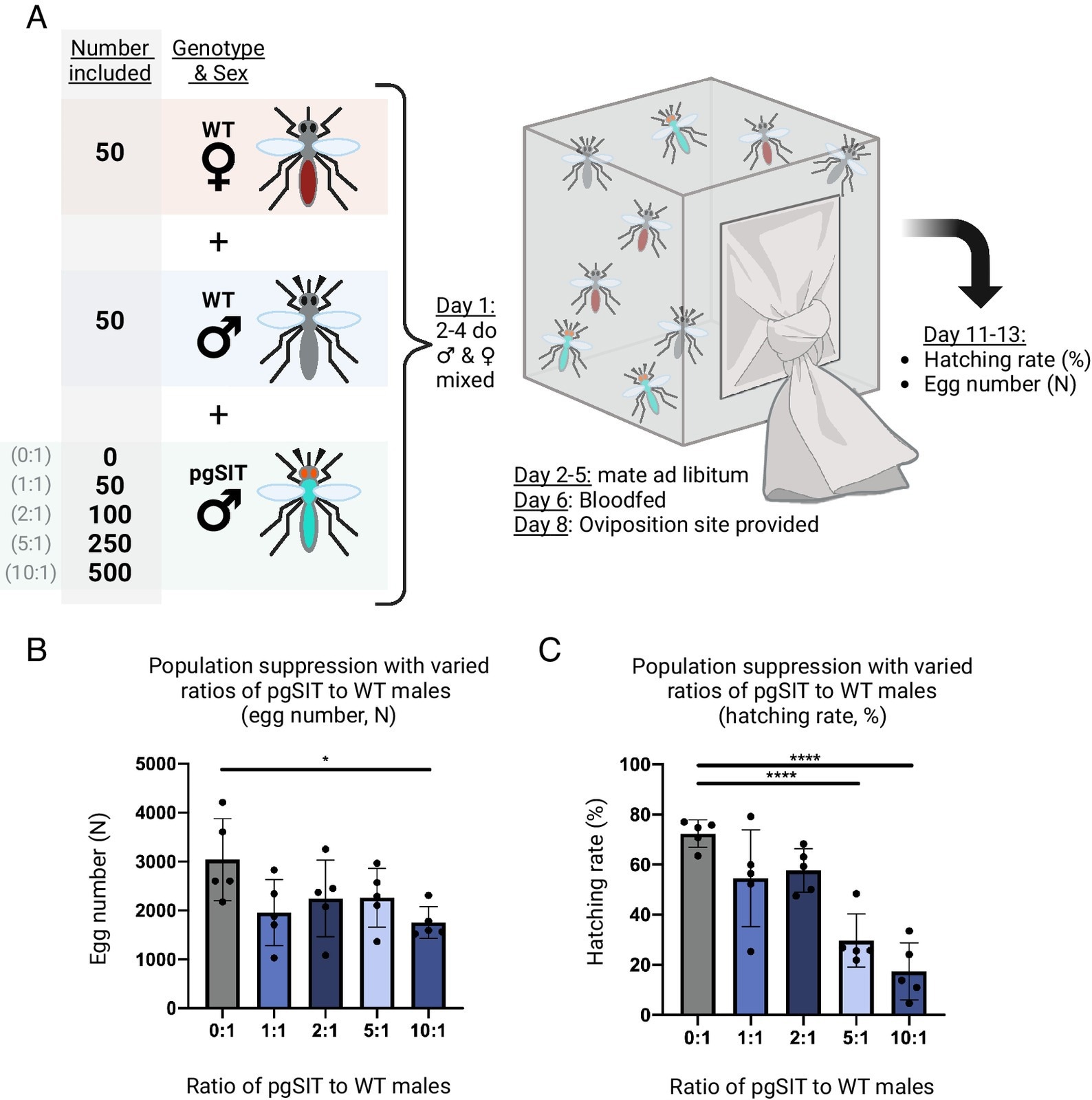Population suppression following the release of pgSIT males at different ratios to wild type. (A) Test suppression cages were established with 50 wild-type males, 50 wild-type virgin females, and either 0, 50,100, 250, or 500 pgSITD15 males (for the 0:1, 1:1, 2:1, 5:1, and 10:1 pgSIT:wild-type male ratios respectively). After mating and blood feeding, the hatching rate was calculated for each cage. (B) The egg counts from population suppression assay cages. Groups 0:1 and 10:1 are significantly different (P < 0.05, Dunnett’s multiple comparisons). Mean and SD shown. (C) Population suppression as measured by the hatching rate (%) from cages suppressed by different ratios of pgSIT males to wild type males. The hatching rate is reported as the percent of eggs that hatched (n% = n 1-d-old larvae/n eggs laid). The 0:1 control group differs significantly with both the 5:1 (P < 0.001) and 10:1 (P < 0.001) groups (one-way ANOVA, Dunnett’s multiple comparisons test). Mean and SD shown. Created with Biorender.com.