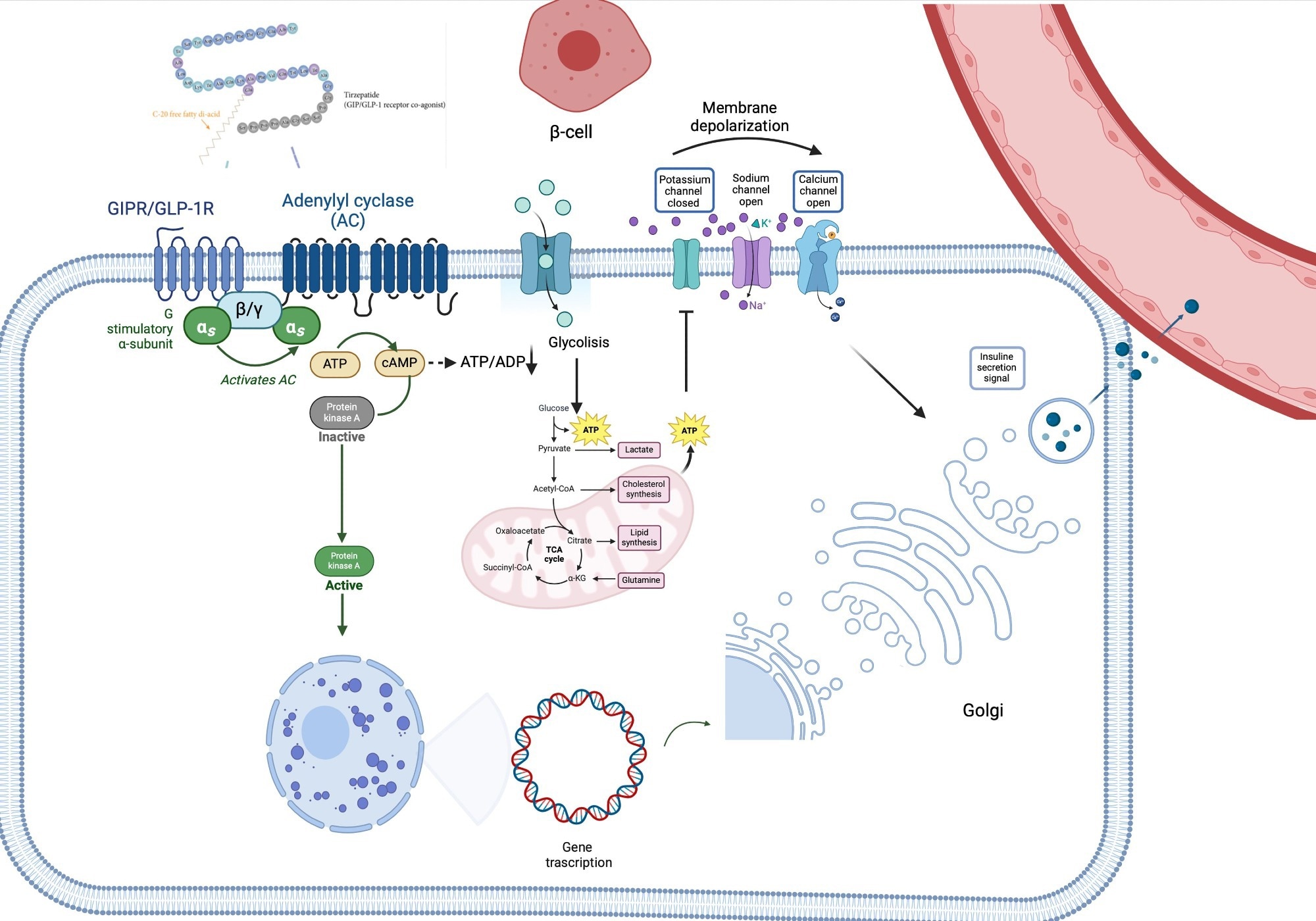 Tirzepatide’s pathway signaling. TZP binds its receptor, leading to the activation of adenylyl cyclase-cAMP-protein kinase A (PKA) pathway and thus stimulating glucose metabolism (glycolysis and Krebs Cycle). The increase of intracellular ATP levels hesitates in the closure of plasma membrane K+ channels, thus triggering β-cell depolarization. Due to depolarization, voltage-gated Ca2+ channels become open, favoring the entrance of Ca2+ into the cell, which concomitantly stimulates the releasing of calcium from the endoplasmic reticulum. This leads to the release of insulin into the bloodstream. Additionally, PKA stimulates insulin gene transcription, leading to insulin synthesis. αs, in vivo-subunit; ADP, adenosine diphosphate; ATP, adenosine triphosphate; β/γ, G protein β/gamma subunits; cAMP, cyclic adenosine monophosphate; GIP-R/GLP-1R, gastric inhibitory polypeptide receptor/glucagon-like peptide 1 receptor; PKA, adenylyl cyclase-cAMP-protein kinase A.Tirzepatide’s pathway signaling. TZP binds its receptor, leading to the activation of adenylyl cyclase-cAMP-protein kinase A (PKA) pathway and thus stimulating glucose metabolism (glycolysis and Krebs Cycle). The increase of intracellular ATP levels hesitates in the closure of plasma membrane K+ channels, thus triggering β-cell depolarization. Due to depolarization, voltage-gated Ca2+ channels become open, favoring the entrance of Ca2+ into the cell, which concomitantly stimulates the releasing of calcium from the endoplasmic reticulum. This leads to the release of insulin into the bloodstream. Additionally, PKA stimulates insulin gene transcription, leading to insulin synthesis. αs, in vivo-subunit; ADP, adenosine diphosphate; ATP, adenosine triphosphate; β/γ, G protein β/gamma subunits; cAMP, cyclic adenosine monophosphate; GIP-R/GLP-1R, gastric inhibitory polypeptide receptor/glucagon-like peptide 1 receptor; PKA, adenylyl cyclase-cAMP-protein kinase A. Study: Tirzepatide against obesity and insulin-resistance: pathophysiological aspects and clinical evidence.