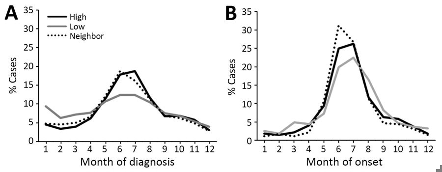The majority of Lyme disease diagnoses occurred in the summer months. Among residents of low-incidence states, a large proportion of disease diagnoses occurred in winter months.