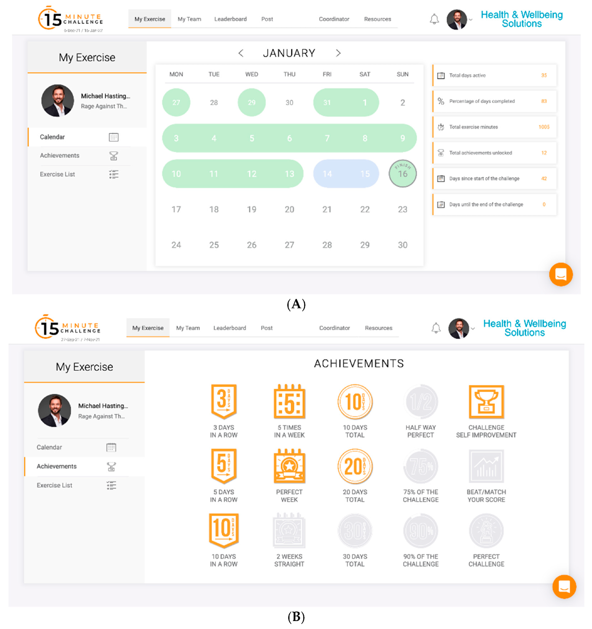 The program facilitated daily 15-minute sessions for physical activity, with participants recording their activities using a mobile app. To motivate participation, the app featured gamification elements like team competitions, social sharing, and personal milestones.