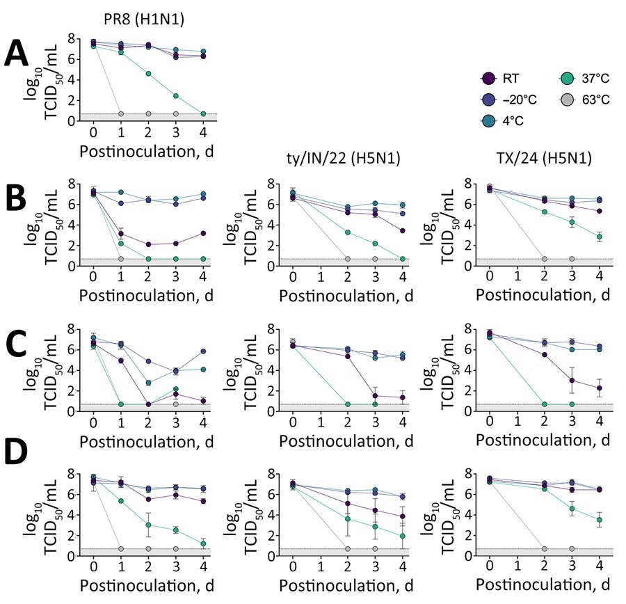 Researchers evaluated the effects of different temperatures on influenza virus viability in milk. It is important to note that the test tube conditions used in the experiment do not precisely replicate actual pasteurization processes in the dairy industry, and this presents a key limitation of the study. Four influenza virus strains were used in the study: one laboratory-adapted strain (PR8) and three H5N1 strains. Commercially available pasteurized whole milk (3.25% fat) was spiked with virus strains at a concentration of 108 50% tissue culture infectious dose/mL of milk or Optimized Minimum Essential Medium (Opti-MEM) control media. The samples were subjected to three distinct heat treatments: 63°C for 30 minutes, 72°C for 20 seconds, and 91°C for 20 seconds.