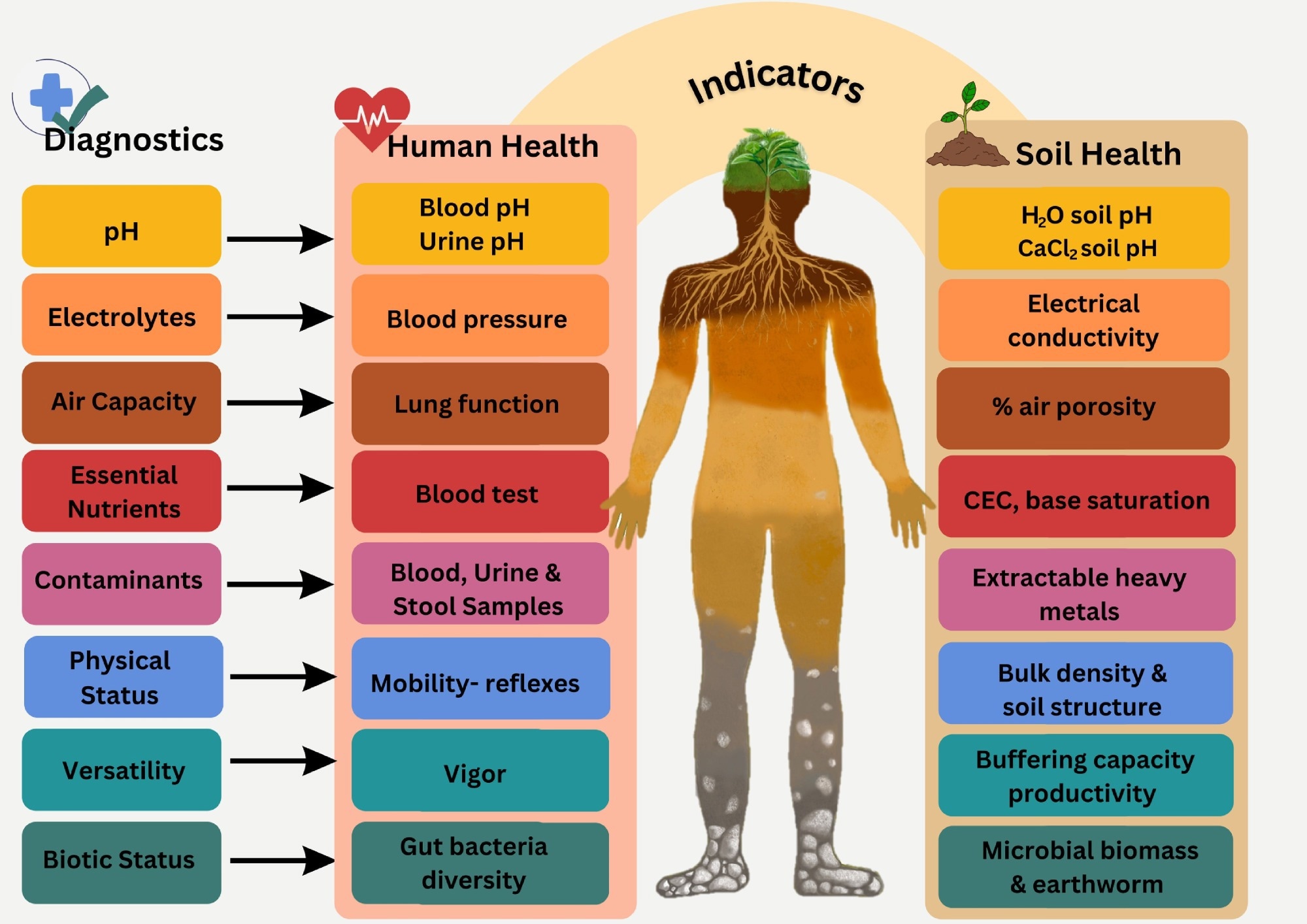 Comparison of several diagnostics that can be used to assess various indicators of human and soil health.