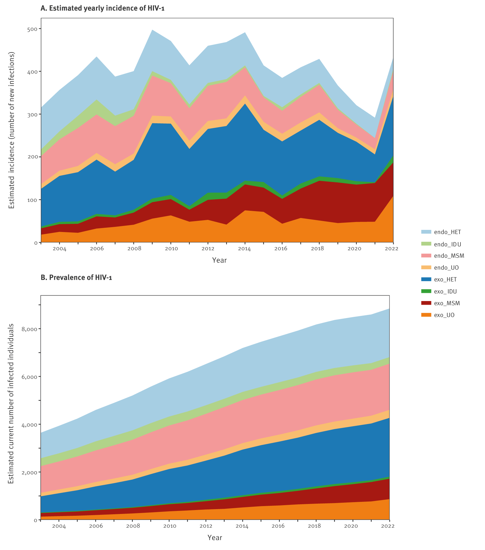 Despite the decrease in incidence rates, the prevalence of people living with HIV increased in all the transmission categories, indicating longer survival due to ART. The exogenous infections category showed the most significant increase in prevalence between 2003 and 2022.