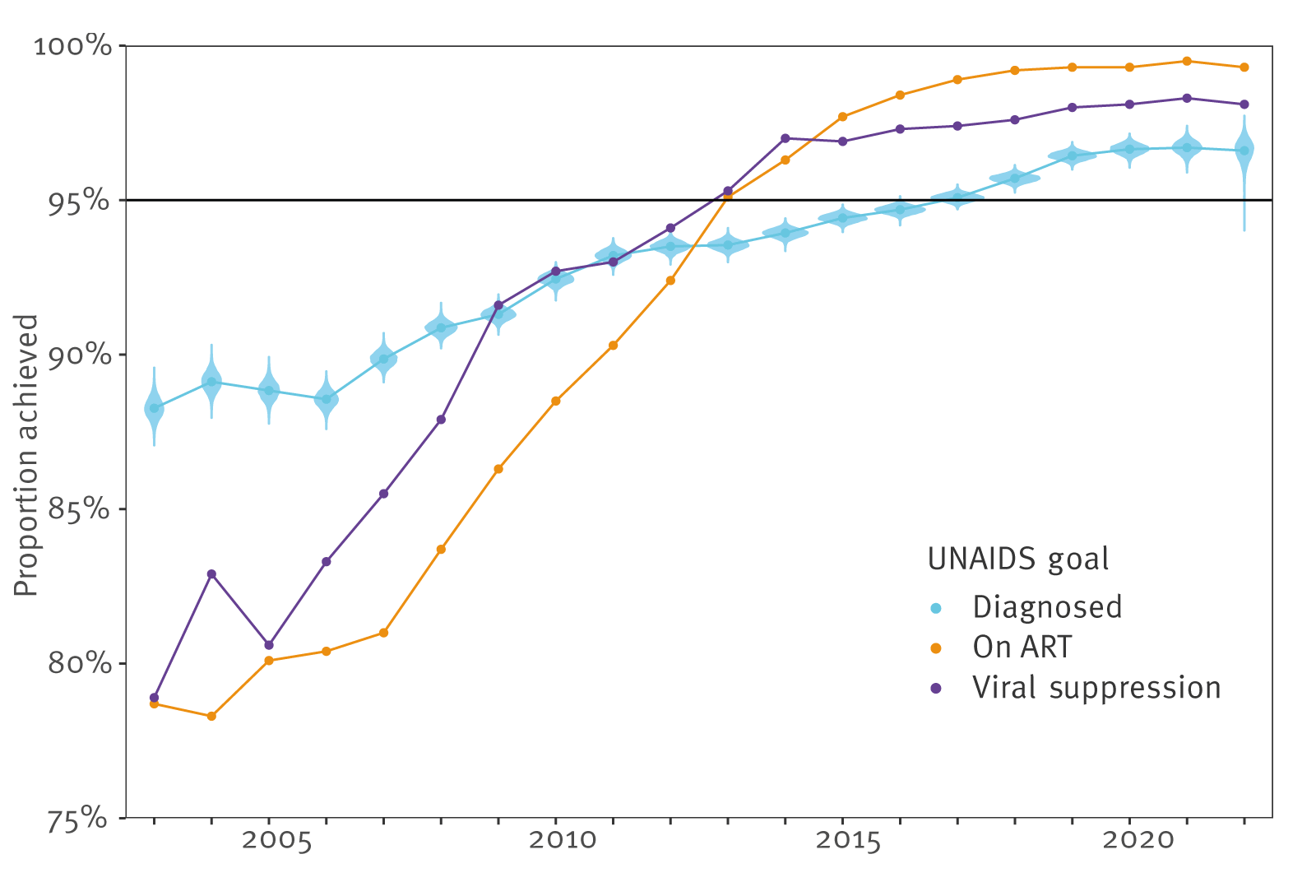 The UNAIDS target of 95-95-95 aims that by 2025, 95% of the individuals with HIV will be diagnosed, 95% of those diagnosed with HIV will be on ART, and 95% of those undergoing ART will have successful viral suppression.