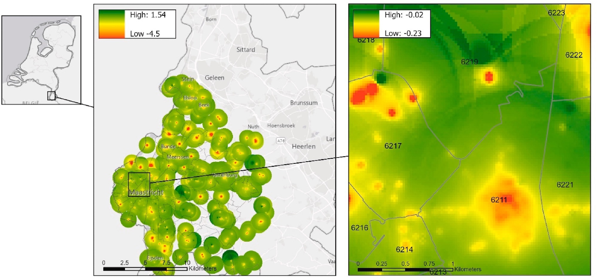 Greater Maastricht study region with Food Environment Healthiness Index heatmap. Green represents areas with healthier food retailers and red with less healthy food.