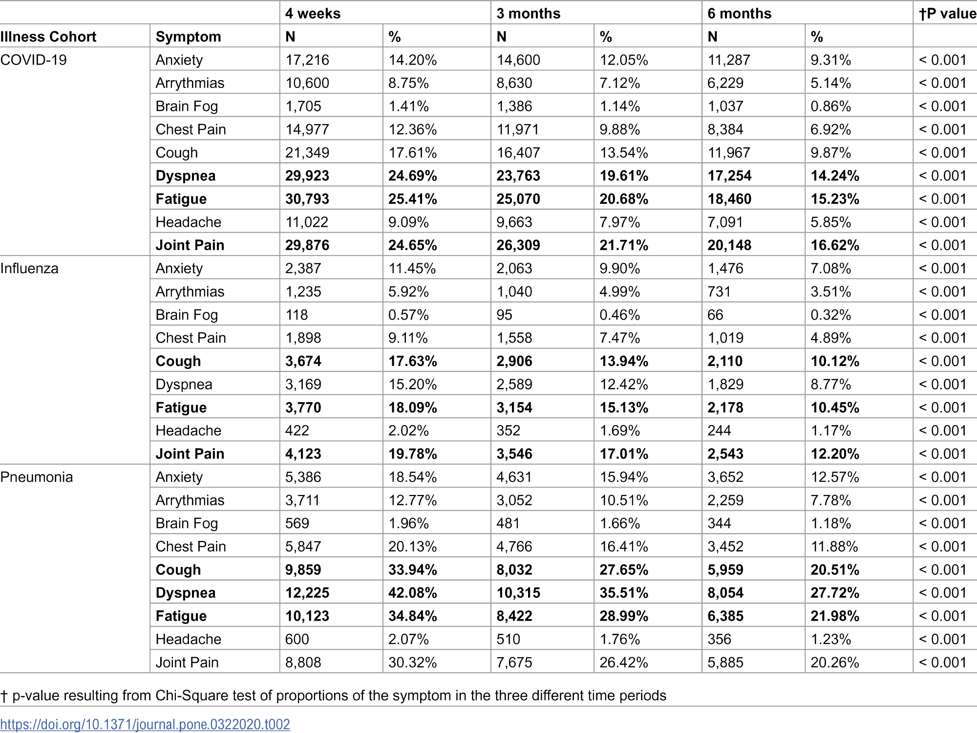 Further, the odds of any symptom in the flu cohort compared to COVID-19 were 0.77 at four weeks and three months and 0.68 at six months. Conversely, the corresponding odds ratios for pneumonia subjects were 2.24, 2.41, and 2.46, at four weeks, three months, and six months, respectively. The most common symptoms after four weeks were fatigue in the COVID-19 cohort, dyspnea in the pneumonia cohort, and joint pain in the flu cohort. After six months, the most common symptoms were the same for the pneumonia and flu cohorts, but joint pain was the most common symptom in the COVID-19 cohort.