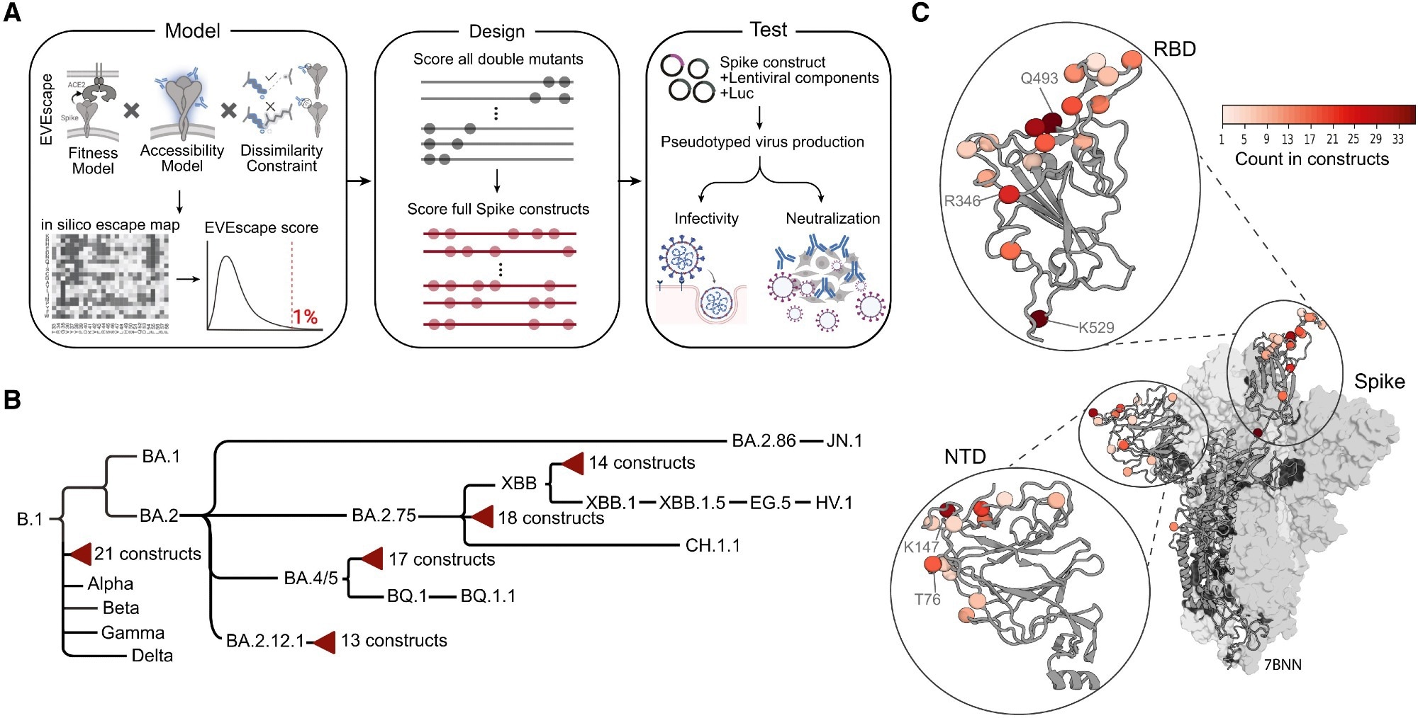 (A) Schematic overview of EVE-Vax for designing antigenic proteins. Single mutants within the top 1% of highest-predicted escape scores were combined to generate all possible double mutants. Double mutants were scored and further combined to create multi-mutant constructs. Designed constructs were subsequently evaluated for infectivity and neutralization sensitivity using pseudotyped virus assays. Parts of the figure were created with BioRender. (B) Cladogram depicting VOCs and computationally designed constructs (red triangles). Branch lengths are proportional to the temporal order of variant emergence. (C) Mutations across the 83 designed spike constructs mapped onto a representative 3D structure (PDB: 7BNN). Coloring indicates the frequency with which a given residue was mutated across all designed constructs.