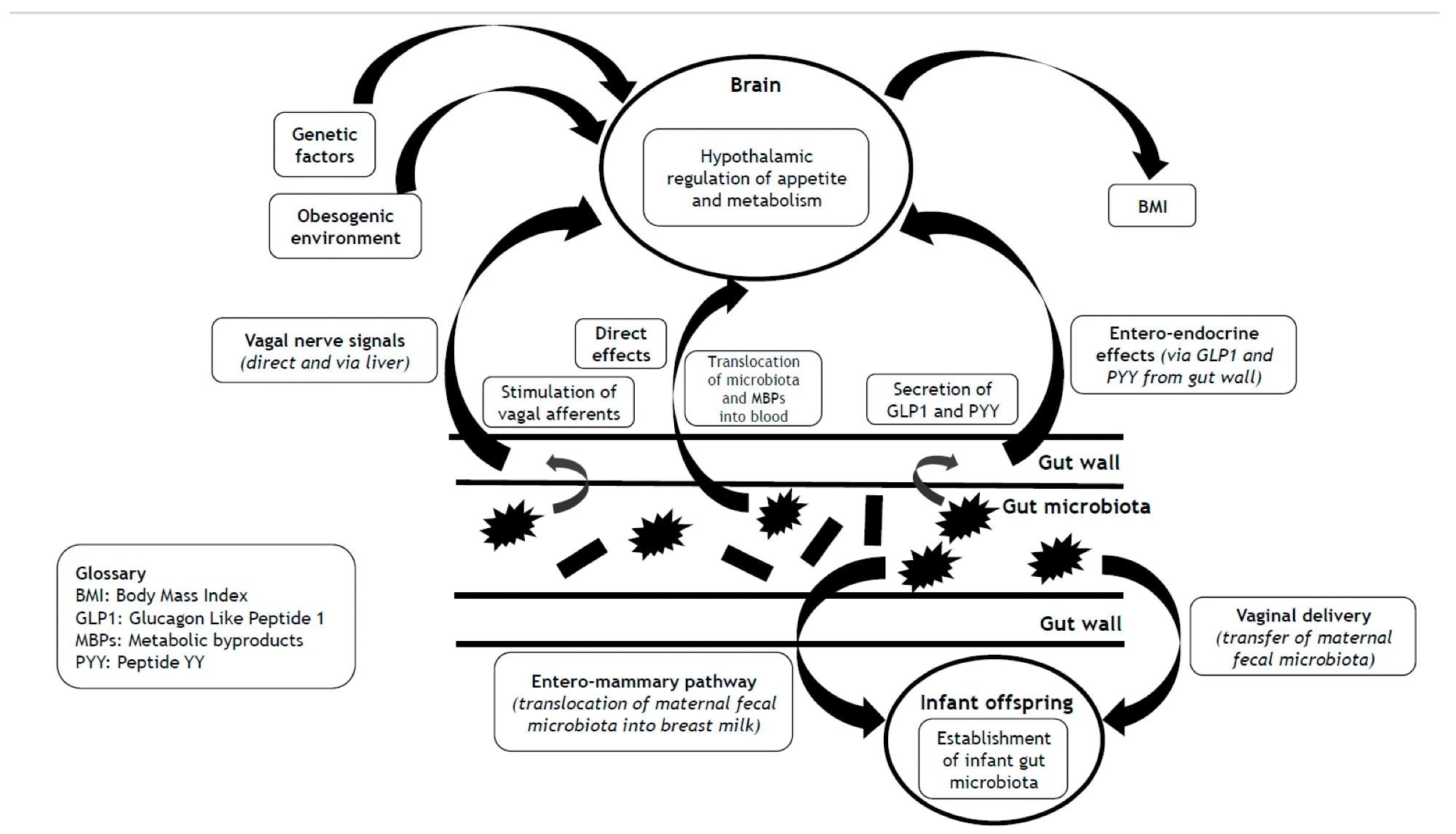 The gut microbiome could contribute to BMI heritability only if it is heritable per se. Caesarean (C)-section eliminates neonatal contact with maternal microbes during parturition; as such, the neonatal gut microbiota are environmentally derived. During vaginal delivery, and also through breastfeeding via the entero-mammary pathway, neonates are exposed to the maternal microbiome. A systematic review found that vaginal delivery resulted in better colonization patterns and overall diversity of infant gut microbiota compared to C-section.