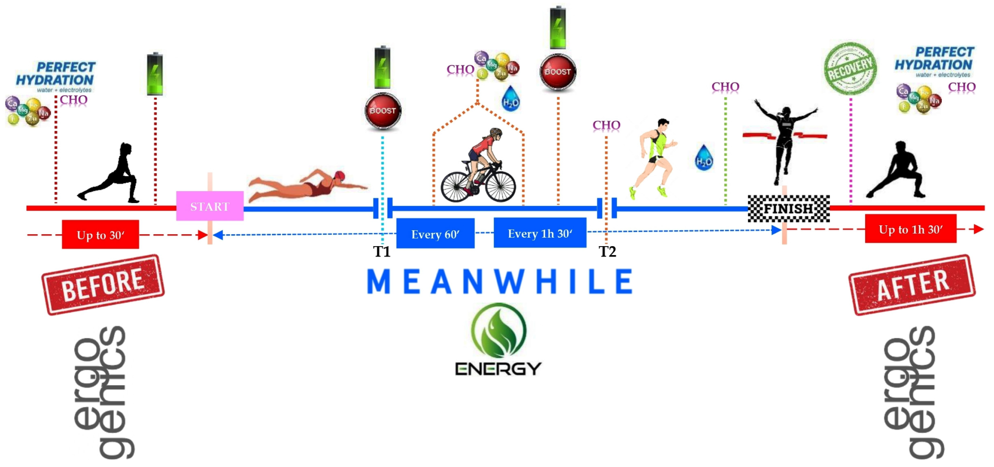 This systematic review compiles current scientific literature evaluating triathlon-specific nutrition and recovery during training (pre-, intra-, and post-training) and competition periods. It aims to enhance athletes’ well-being and performance by identifying optimal triathlon support strategies and highlighting topics for future research in sports nutrition.