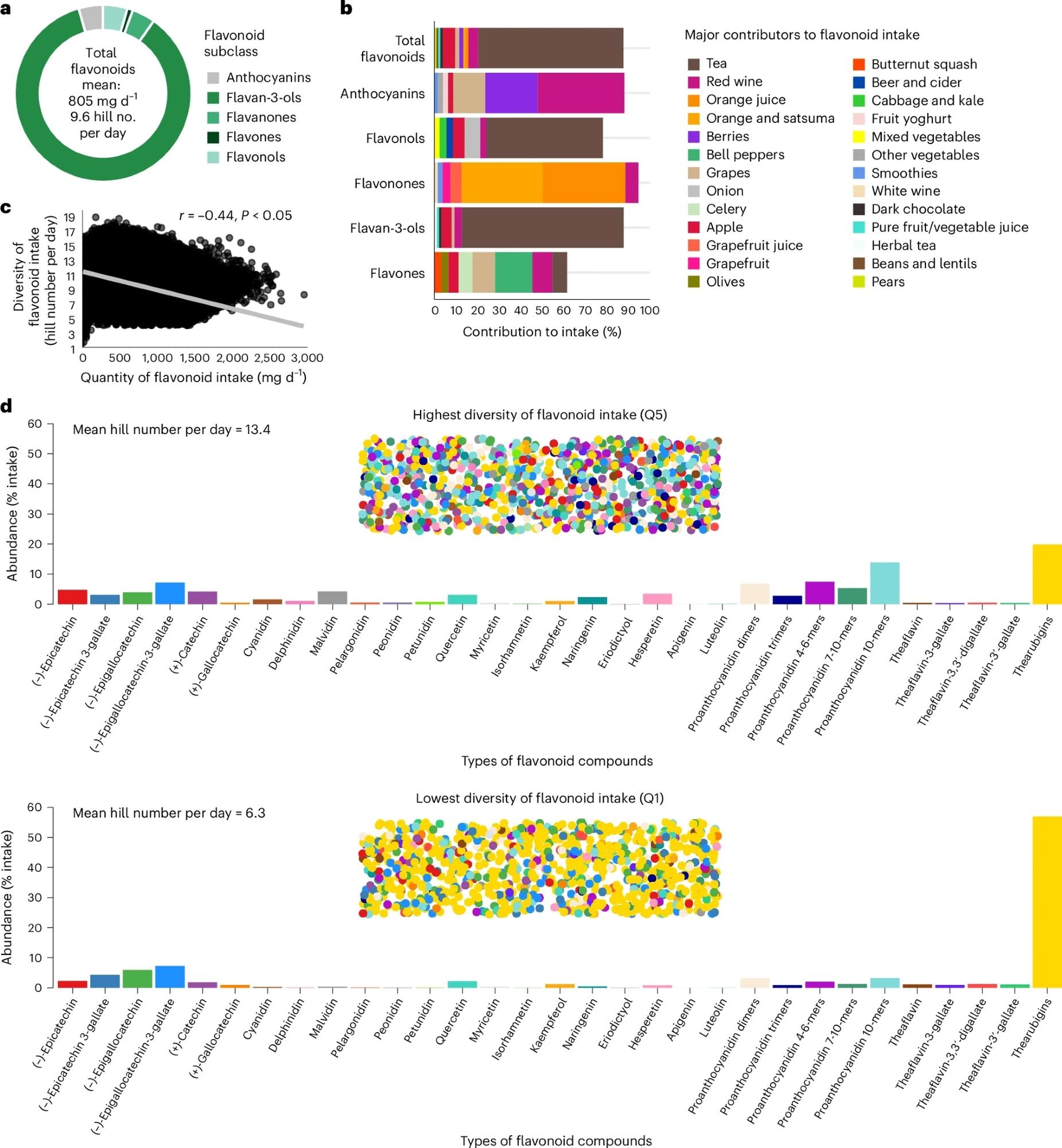 a, Composition of flavonoid intake. b, Major dietary contributors to flavonoid intake, showing the topmost contributors to intake only; blank spaces up to 100% represent other smaller contributors that are not shown. c, Two-sided Pearson correlation between quantity and diversity of flavonoid intake. d, Diversity of flavonoid consumption among participants with the most (Q5) and least (Q1) diverse intakes. In d, the bar charts are matched for quantity of flavonoid intake (1,000 mg d−1) and show the average abundance (% intake) of each flavonoid per day. The dotted areas represent each diet, where each circle is an individual flavonoid and each colour is a different flavonoid (corresponding to the colours and distribution on the bar charts). Data from participants with ≥2 Oxford WebQ dietary questionnaires (n = 124,805).a, Composition of flavonoid intake. b, Major dietary contributors to flavonoid intake, showing the topmost contributors to intake only; blank spaces up to 100% represent other smaller contributors that are not shown. c, Two-sided Pearson correlation between quantity and diversity of flavonoid intake. d, Diversity of flavonoid consumption among participants with the most (Q5) and least (Q1) diverse intakes. In d, the bar charts are matched for quantity of flavonoid intake (1,000 mg d−1) and show the average abundance (% intake) of each flavonoid per day. The dotted areas represent each diet, where each circle is an individual flavonoid and each colour is a different flavonoid (corresponding to the colours and distribution on the bar charts). Data from participants with ≥2 Oxford WebQ dietary questionnaires (n = 124,805).