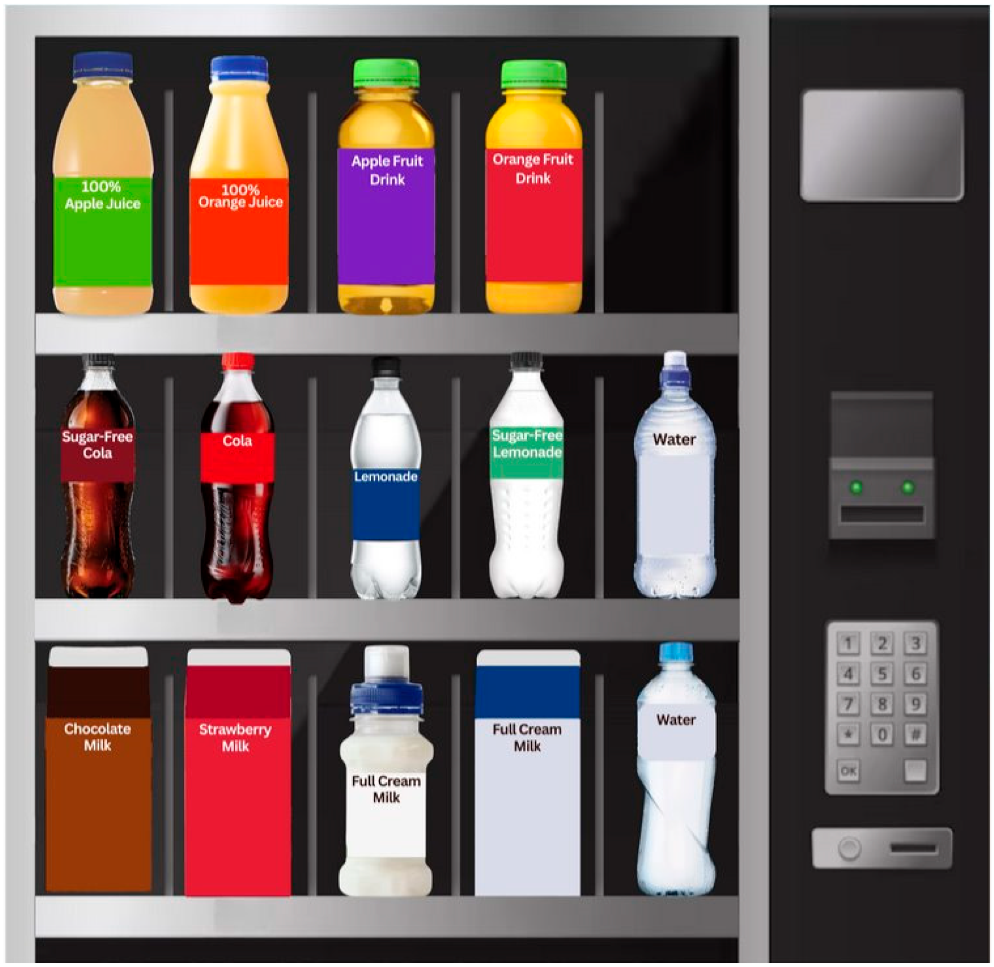 A simulated vending machine displays a variety of beverages, including 100% fruit juice, fruit drinks, soft drinks, sugar-free sodas, flavored milk, plain milk, and bottled water.