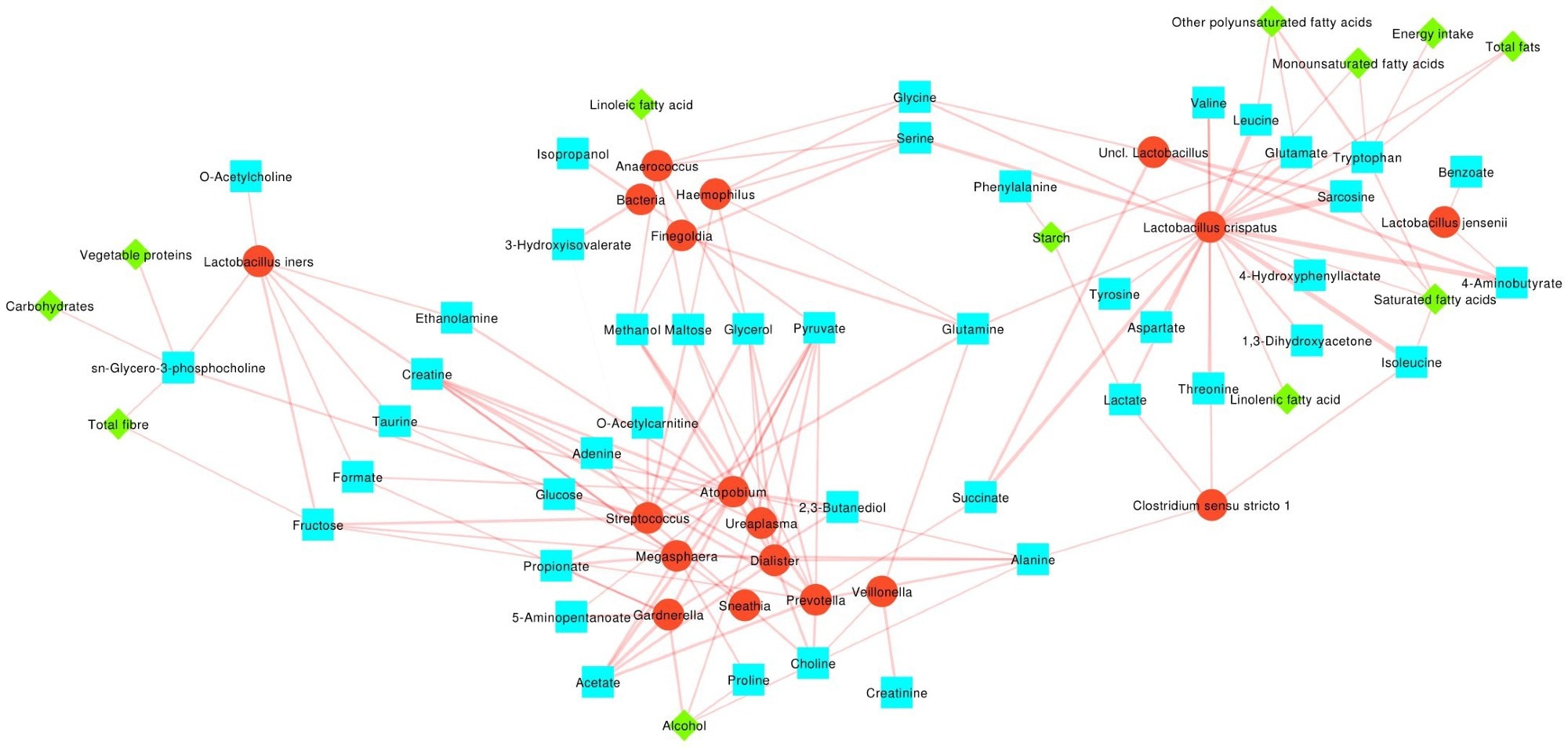 Network representing the Spearman correlation values among bacterial, metabolite and macronutrient abundances. Bacterial taxa are depicted as red circles, metabolites as cyan squares and macronutrients as green diamonds. Edges thickness is proportional to the correlation coefficient. Only significant (p<0.05) correlations are represented. Bacteria, metabolites and macronutrients are clustered according to the indicator species analysis over the three CST groups considered.