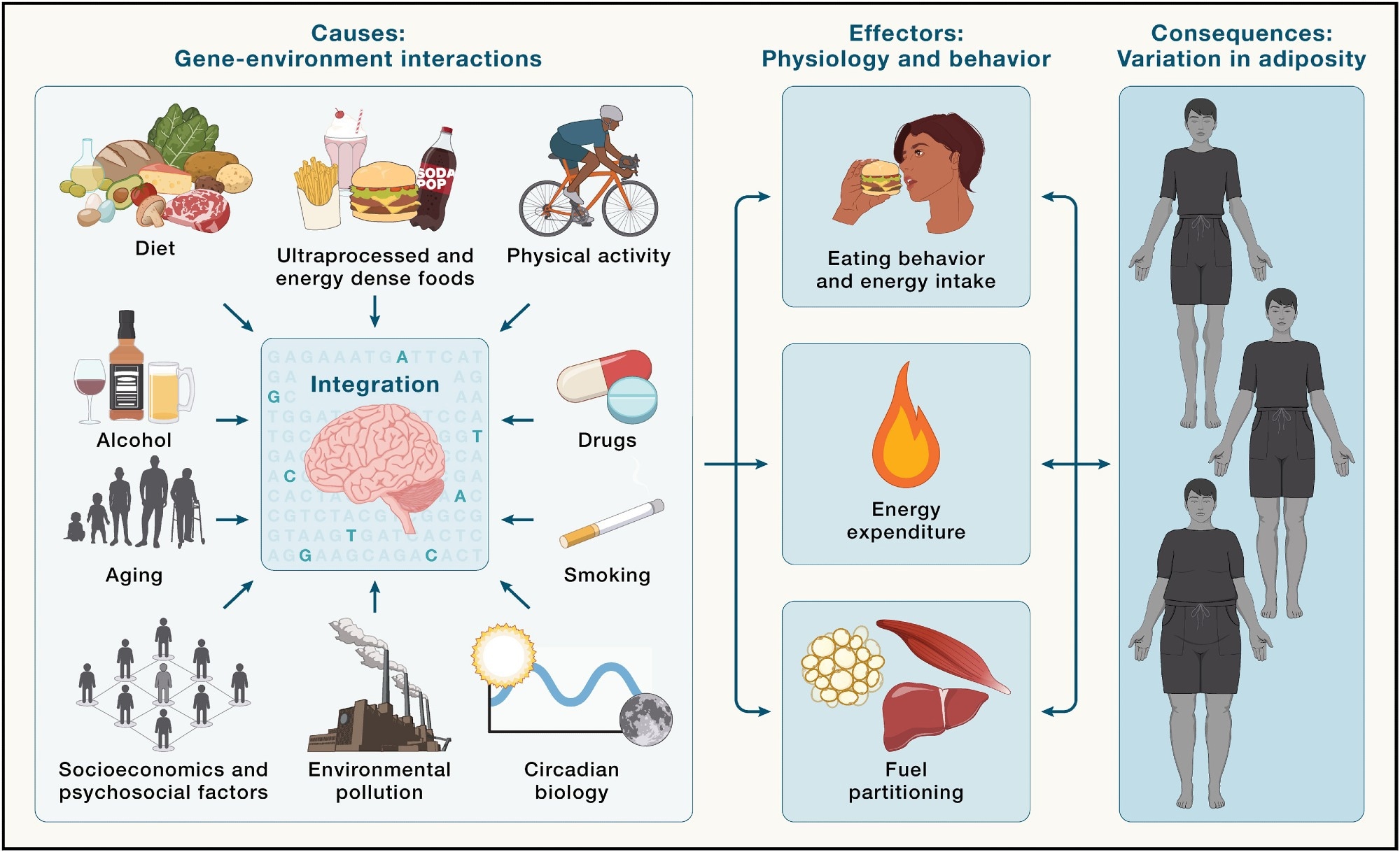 Brain integration of environmental cues in the regulation of energy balance and adiposity - Environmental factors (left) are integrated by the brain in the context of an individual's genetic makeup (illustrated by highlighted SNPs) and epigenetic profile. In response, the brain regulates behavioral and physiological outputs, such as energy intake, energy expenditure, and fuel partitioning (middle), which all influence energy balance, ultimately shaping interindividual variation in adiposity (right).