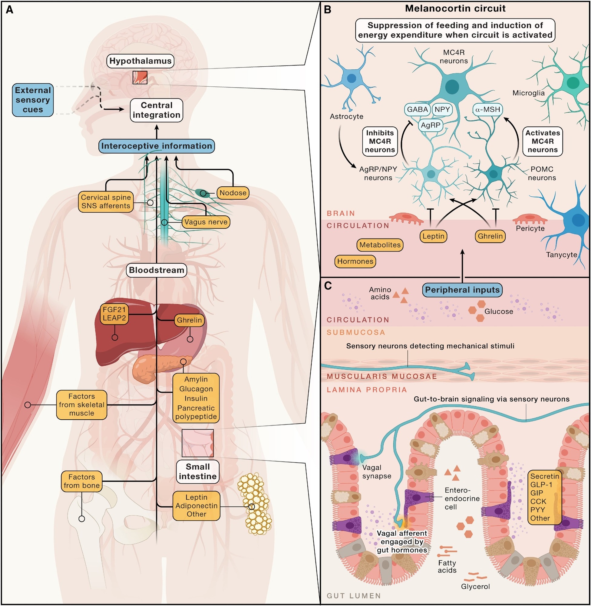 Hormonal, metabolic, and neural inputs to brain circuits regulating energy homeostasis - (A) Simplified overview of peripheral signals arising from multiple organ systems, along with sensory cues from the external environment. These signals are integrated by the central nervous system to regulate energy intake and expenditure, maintaining stable adiposity over time. This regulation involves both long-term energy storage signals, such as leptin, and short-term signals related to immediate intake of energy, like gastrointestinal hormones and nutrients. (B) The arcuate nucleus of the hypothalamus harbors the melanocortin circuit, which is highly responsive to deviations in circulating hormones (e.g., those from the gastrointestinal tract) and the adipose tissue and metabolites. Central to this circuit are hunger-promoting AgRP neurons and satiety-promoting POMC neurons. These neuronal populations modulate energy balance via inhibitory and excitatory inputs to downstream MC4R-expressing neurons, respectively. (C) Many peripheral inputs influencing brain circuits that regulate energy balance originate in the gut. Enteroendocrine cells release hormones, like secretin, GLP-1, GIP, CCK, and others, into the circulation in response to various stimuli, such as the presence of luminal nutrients. Additionally, vagal afferents relay mechanical and chemical information—such as gut distension and nutrient content—from the gastrointestinal tract to the brain.