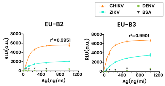 Figure 2. Detection of serially diluted (0-1000 ng/mL) recombinant CHIKV-E2 (Sino Biological, 40440-V08B), ZIKA-E (Sino Biological, 40543-V08B4), DENV-E (Sino Biological, 40471-V08B) proteins using peptide aptamers B2 and B3 10. Image Credit: Sino Biological Inc