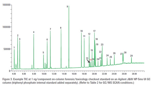 For the assessment a 28 component mixture of GC/MS forensic toxicology analyzer was obtained from Agilent Technologies, Inc. (Santa Clara, CA) (p/n 5190-0471). This was serially diluted using volumetric glassware (Class A) and positive displacement syringes.