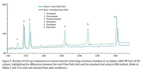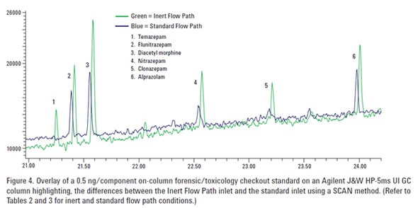 Drugs of abuse that are tested using a modern GC/MS system may get adsorbed onto any of the flow path surfaces as they are chemically active substances.