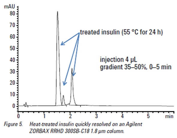 The results showed that using Agilent ZORBAX Rapid Resolution High Definition (RRHD) 300SB-C18 1.8 µm columns resulted in faster and reliable separation of the isoforms and purified versions of insulin from the sample.