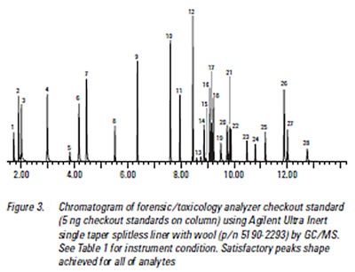 The Agilent GC/MS Forensic/Toxicology analyzer was used to check out and analyze the standard 28 component analyte in order to assess the functioning of Ultra Inert Liners with glass wool.