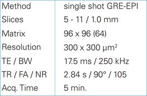 117/16 Bruker BioSpec ('H @ = 500 MHz); BGA9s gradient system (Gmax=750 mT/m; min. ramp time of 125 µs); quadrature volume resonator (inner diameter 72 mm) for transmission; Avance II electronics; ParaVision; rat brain quadrature surface coil (-30x30 mm2) for reception.