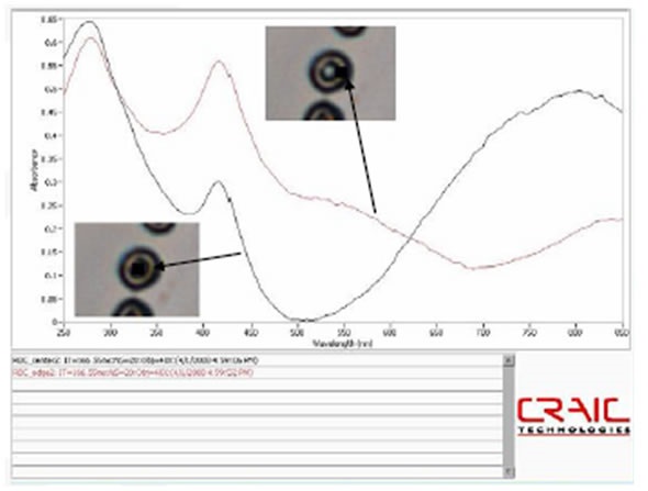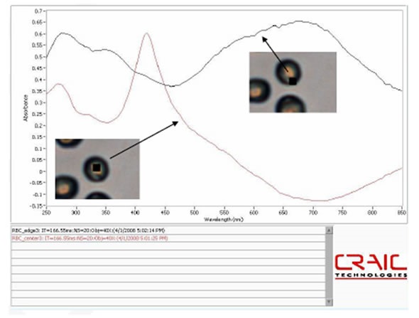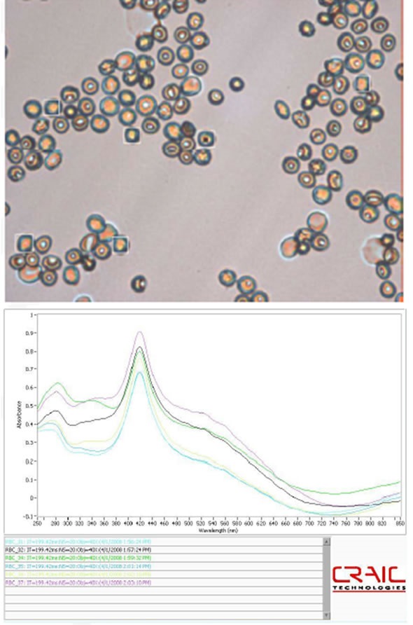 CRAIC Technologies offers the 20/30 PV™ microspectrophotometer, which enables quick, easy and non-destructive analysis of biological materials. For this experiment series, the 20/30 PV™ microspectrophotometer was configured for UV range absorbance microscopy and spectroscopy of individual RBCs.   It was fitted with permanently calibrated variable apertures in order to best measure different sized samples under controlled conditions.