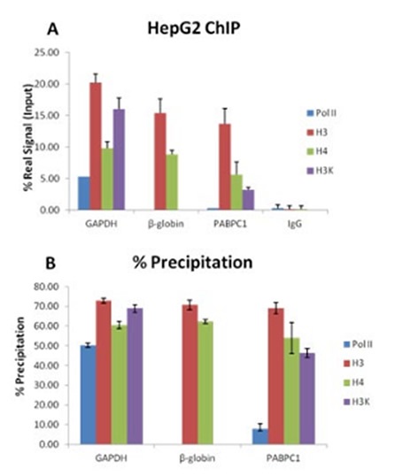 Figure 3: Multiple target ChIP onto human gene promoters in liver carcinoma cells. (A) % real signal relative to Input (B) % precipitation of the input sample.