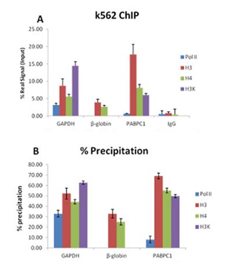 Figure 5: Multiple target ChIP onto human gene promoters in Leukaemia carcinoma cells. (A) % real signal relativeto Input (B) % precipitation of the input sample.