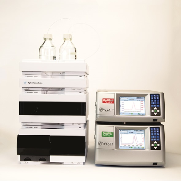 SEC was carried out using the Agilent 1260 HPLC system equipped with a degasser, an auto sampler and an isocratic pump. The separation column used was the Superose 12 300/10 from GE Healthcare. A DAWN® HELEOS® 18 angle light scattering detector featuring a WyattQELS™ for online DLS detection, an Agilent variable wave-length detector at 280 nm and an Optilab® rEX refractive index detector were used for detection as shown in Figure 1. ASTRA® software from Wyatt Technology was used for the SEC-MALS analysis.