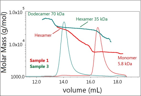 On the contrary, the majority of Sample 2 exists as a hexamer (Figure 3, blue) and a considerable fraction seems to be undergoing monomer-dimer equilibrium. This lower molecular weight peak elutes a little faster when compared to the monomer peak for Sample 1 and the quantified molar mass is heterogeneous across the peak, spanning the masses of the monomer and dimer (~6-12 kDa).