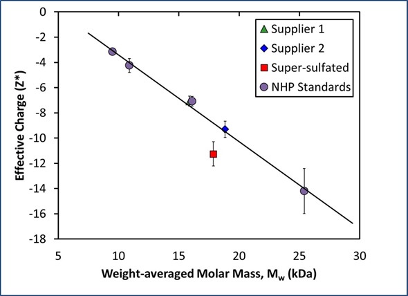 Based on their molecular weight measurements, the net charges for unfractionated heparin from Suppliers 1 and 2 are within a 2% range of the predicted value. On the other hand, the measured net charge of the super-sulfated heparin from Supplier 2 is approximately 30% higher than the value expected for a heparin of that size.