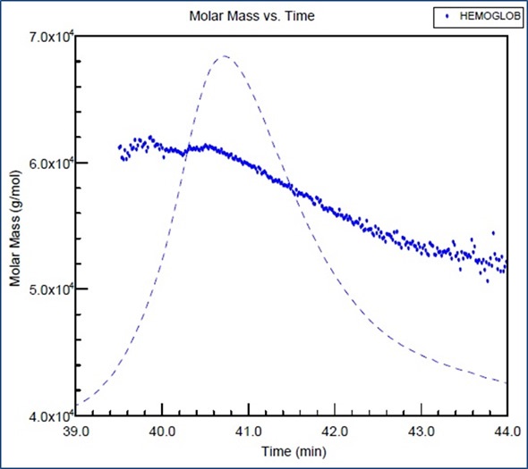 The molar mass of hemoglobin is plotted against the elution time in Figure 1. The molar mass across the peak is not constant, which may be due to an equilibrium shift from a tetramer to a dimer occurring during the chromatography run.