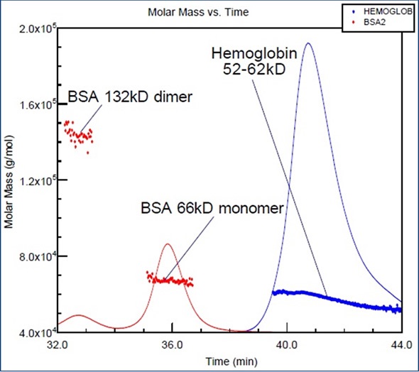 When using BSA as a calibration standard (as many laboratories do), the molar mass of hemoglobin could be significantly underestimated. On the other hand, incorrect conclusions can be avoided by combining the chromatography process with a DAWN® or miniDAWN MALS detector.