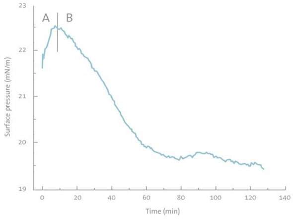 When the same system was tested using different monolayer lipids and a different subphase protein, chitosan could not remove BLG from a neutral phospholipid monolayer, but similar behavior to DMPA monolayer was observed for another negatively charged lipid layer. This suggests that the negative charge may play an important part in the removal of chitosan–BLG complexes from the monolayer.