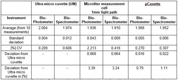 It can be seen from the µCuvette results that the values were in line with the expected results, and also with the measurements acquired with the ultra-micro cuvette. This means that the µCuvette has a lower deviation when compared to a competing microliter measurement cell. Such low standard deviations imply that the µCuvette can provide a high degree of precision in measurements.