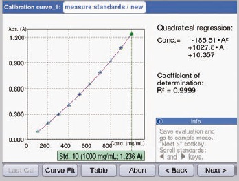 On completion of the standard programming, the “Next” soft key leads to the “Measure standards” area. This facilitates the measurement of all standards in succession or any random order. Measurements are repeated, if required. The “Standards” button is used to measure a standard. The “Curve fit” soft key drafts the type of standard analysis for the obtained values.