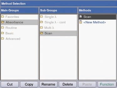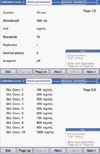 The parameters to be scanned are subsequently determined. The “Edit” soft key in the “Check parameters” area enables adjustment of the range of wavelength and the cuvette’s path length (Figure 6).