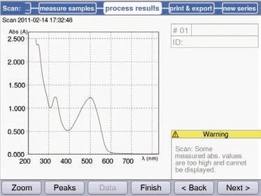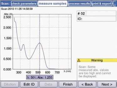On selection of all parameters, the “Next” soft key leads to the “Measure samples” area. To scan the wavelength, water is initially blanked followed by the sample solution of 0.01% (w/v) Ponceau-S (Figure 7).