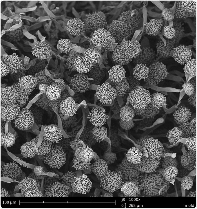 The two figures shown below depict Aspergillus niger, isolated from coffee, and Rhizopus stolonifer, isolated from bread. Aspergillus niger, a common food contaminant, is also known as black mold as it is identified by its black spores, although the contaminant can be confused with other species. A. niger is less likely to cause human diseases than other Aspergillus species, but if present in large quantities, it can cause fungal ear infections.