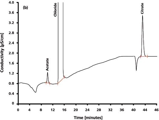 IC measurement on a Metrosep A Supp 7 - 250/4.0 using Na2CO3 gradient elution, followed by sequen­tial suppression and conductivity detection. Anion standard including acetate and citrate.