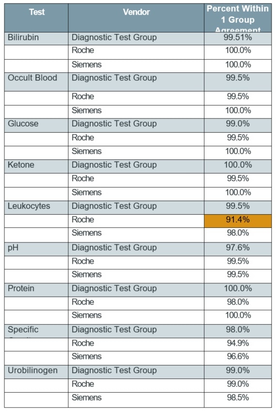 On expanding the agreement criterion to ±1 group, the disagreement was considerably reduced for the Roche strips, except for protein (91.5% agreement) and leukocyte (79.2% agreement), and with both agreement rates being considerably different from the unstressed (control) agreement.