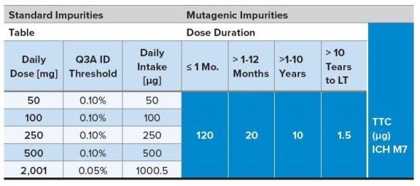 Levels of non-mutagenic impurities in drug substances are typically evaluated at 0.05% weight/weight levels using relative peak area or other standard detection techniques as per ICH Q3A guidelines. Recommended thresholds are evaluated by dose duration and daily intake. For a concentration below 10 ppm, these limit MIs to below 1.5 µg per day. Thus, a technique with 70-fold lower limit of detection may be needed, as described in Table 1. Introduction of MIs can be viewed, in a way by categorizing three primary sources with differing detection complexities according to the source of the MI.