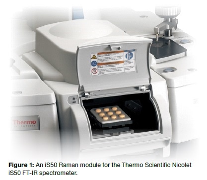 All the samples came through the Albuquerque Police department after preparation. They were therefore handled as per the guidelines of Schedule I controlled substance handling. They were obtained inside double bags, blister packs or glass vials. The analyses in all cases were performed using a Thermo Scientific™ Nicolet™ iS50 FT-IR spectrometer fitted with a calcium fluoride beam splitter as well as an FT-Raman module that had a 1064 nm laser, as shown in Figure 1. For each spectrum, a cycle of acquisition took about 75s, including 64 scans coadded at a resolution of 8 cm-1, the laser power being set at 0.5 mW. The spectra were then compared with data available in the Thermo Scientific Law Enforcement and Security (LEnS) Raman and DEA Raman libraries, with the help of the OMNIC library search and Specta multicomponent search tools.