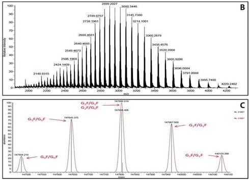 The determination of the primary sequence of the protein antibody is confirmed by finding the intact mass in this way. However, this does not permit variations in the sequence - such as leucine/isoleucine mutations or amino acid swapping - to be verified. Another use of this technique is to help evaluate the relative ratios of the glycosylated forms which have been expressed, because these modified forms are often bestowed with immunogenicity or biological activity by the sugar residues.