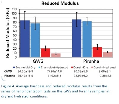 In the current experiment, the nanoindentation trends were comparable to previous experiments to measure the microhardness on other samples. Enameloid and dentin parts of a GWS showed microhardness to be 1.56 and 0.31 GPa, respectively, under dry testing conditions, using indents of approximately 60 µm at about 200 µm distance between them. On the other hand, the size of the nanohardness indents was about 2 µm with 75 µm distance between them.