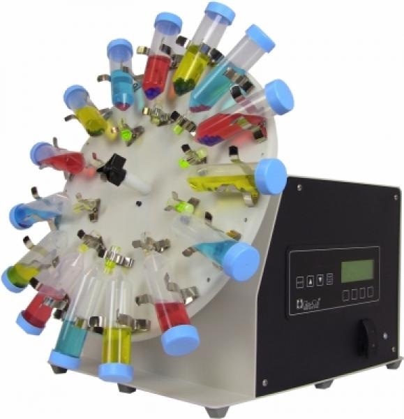 Tubes with a diameter of between 10 and 30 mm can be facilitated via the attachment of small or large clips, with the option to house vials with a variety of different geometries simultaneously and enable simultaneous mixing of solutions with widely ranging homogeneities.