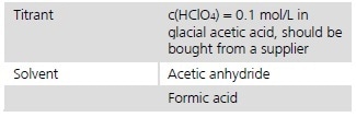 For the determination of the blank, 4 mL of formic acid and 50 mL of acetic anhydride are placed into a titration beaker. The stirred solution is then titrated with c(HClO4) = 0.1 mol/L in glacial acetic acid until the equivalence point is passed. The volume at which the equivalence point is achieved corresponds to the blank value.